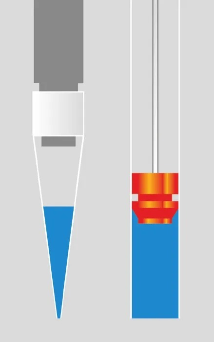 Uses the positive displacement principle, where the piston is in direct contact with the liquid rather than separated by an air cushion.The tight-fitting piston wipes the capillary walls nearly dry, allowing dispensing “to the last drop” with very low residual wetting and good reproducibility.