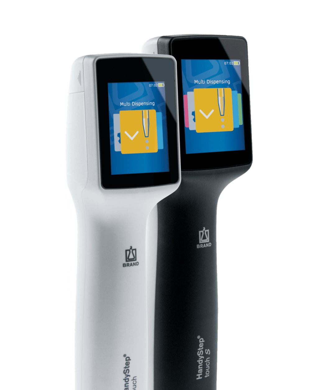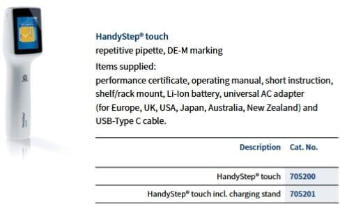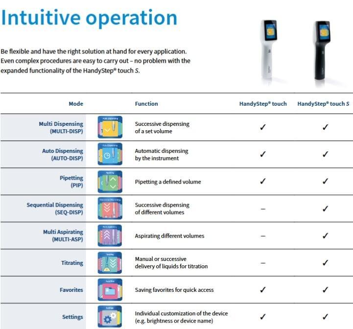 The HandyStep® touch is an advanced electronic model with a touchscreen, fast volume setting, calibration reminders, and the ability to enter volume either by swiping or typing, offering versatile and precise liquid handling.