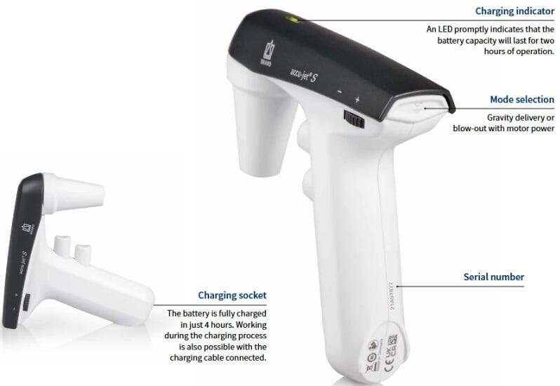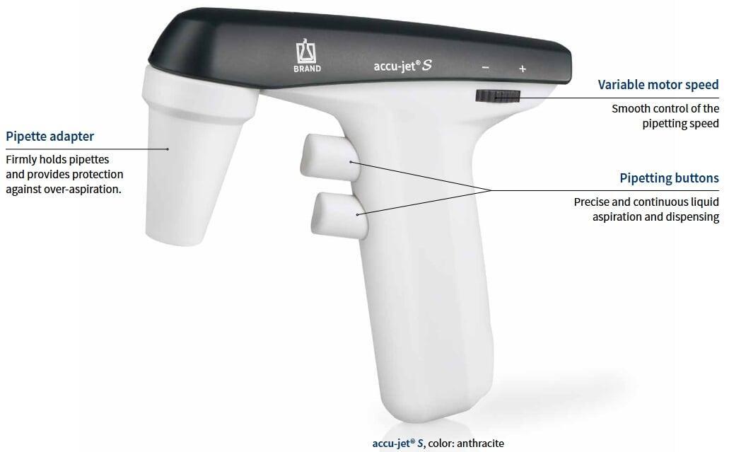 The accu-jet® S offers single-handed speed control, ergonomic handling, and compatibility with both glass and plastic pipettes ranging from 0.1 to 200 ml. It supports gravity and powered blow-out dispensing for maximum flexibility and fills a 25 ml pipette in just 3 seconds.